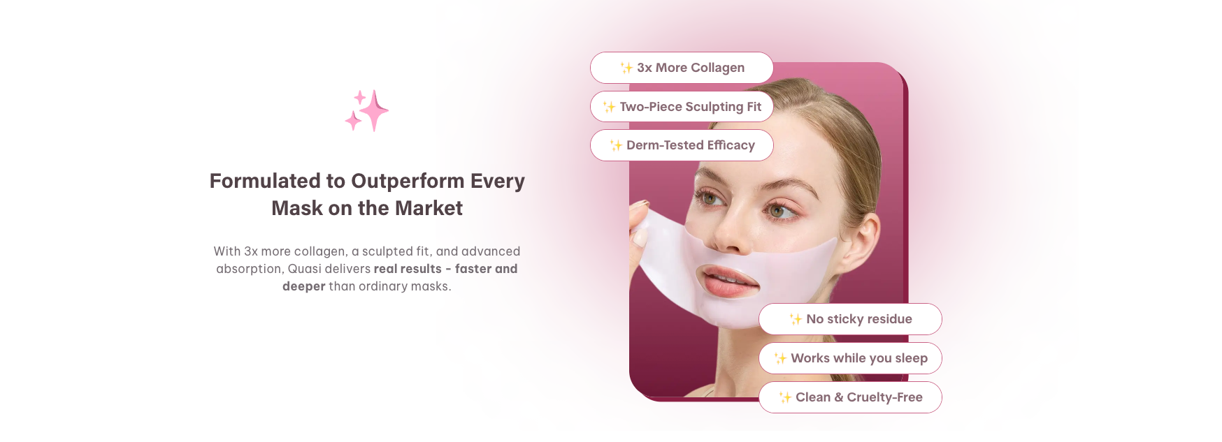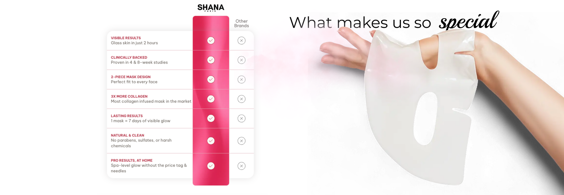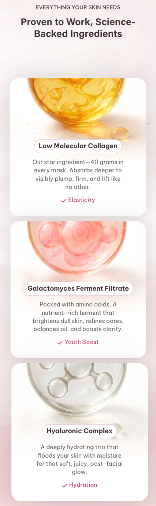 Everything. We use 3x more collagen, a two-piece custom-fit design, and a low-molecular blend of peptides and hydration complexes for visible results — fast. No stickiness, no gimmicks. Just real glow.
